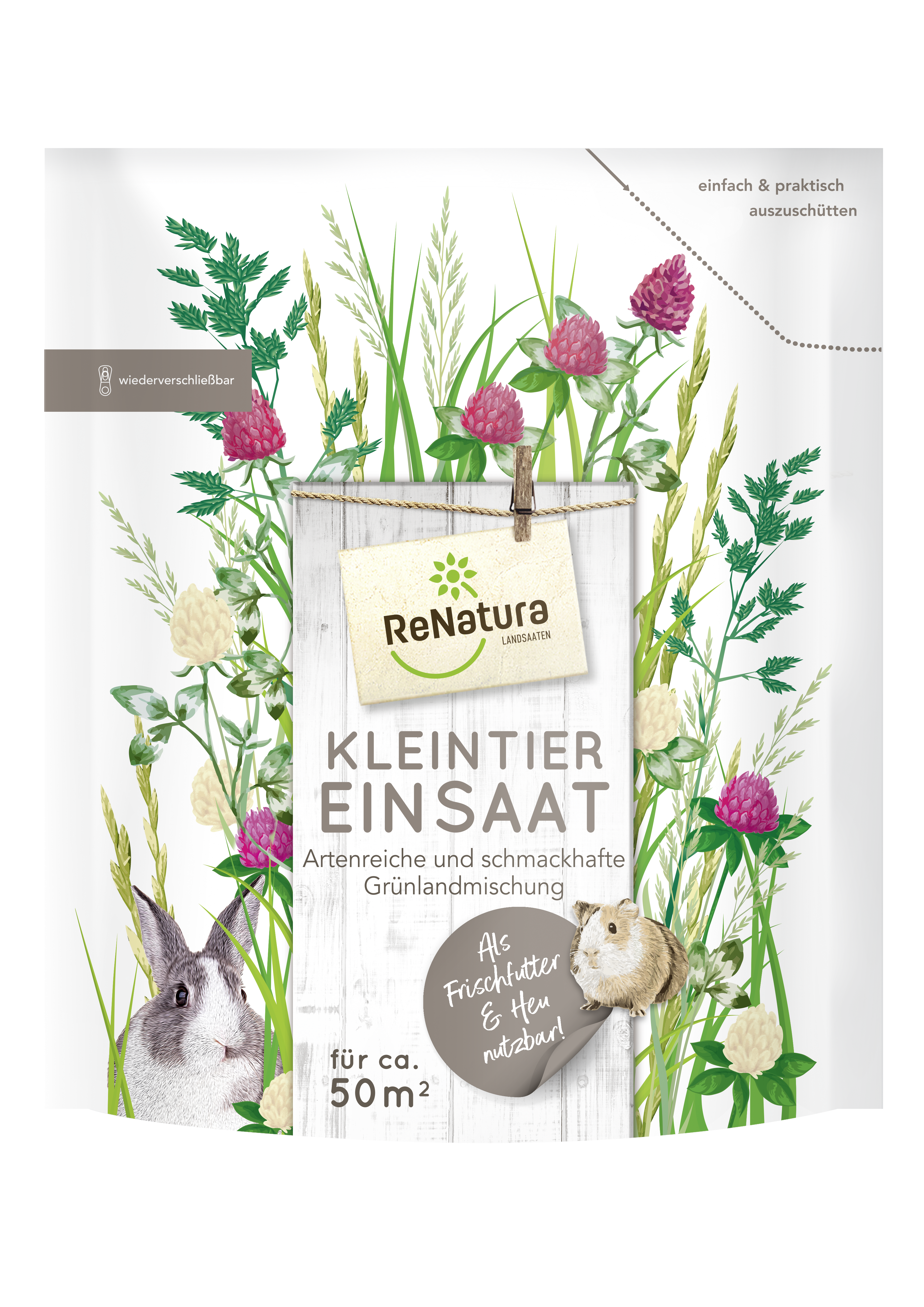 Die Kleintiereinsaat von ReNatura® ist die ideale Mischung für alle die ihren Schützlingen gesundes Futter aus eigenem Anbau oder einen Auslauf auf geeignetem Aufwuchs zur Verfügung stellen möchten. Durch die Vielzahl an enthaltenen Gräser- und Kleearten lässt sich ein schmackhaftes Frischfutter oder abwechslungsreiches Heu erzeugen.